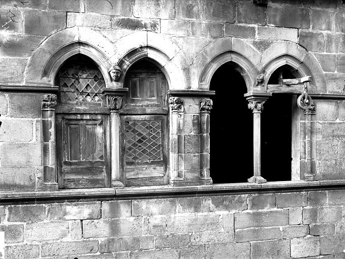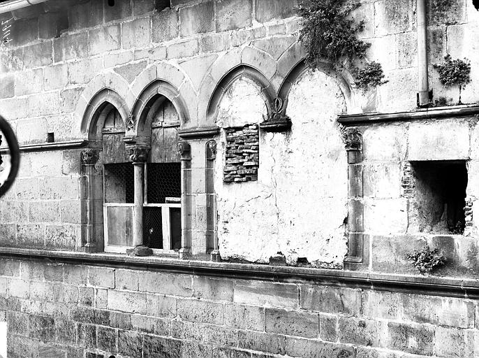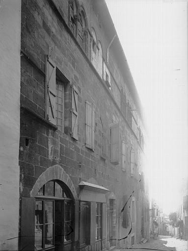 Construction en pierre de taille. Rez-de-chaussée à arcades. Ouvertures du premier étage modernisées. Au deuxième étage, deux groupes de quatre baies, par paires. Chapiteaux sculptés (feuillages, têtes humaines, animaux...).