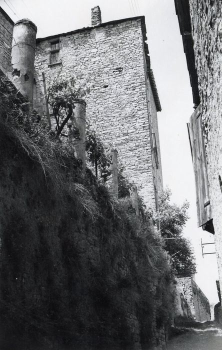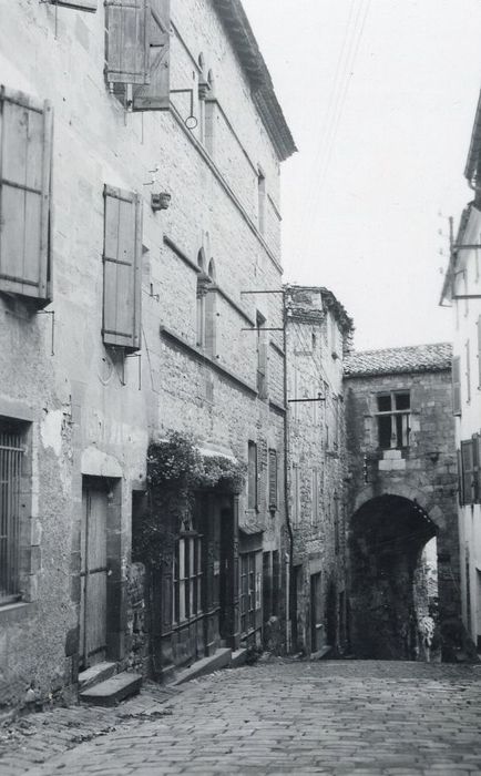 L'immeuble fait partie d'un ensemble qui s'étendait depuis la porte fortifiée jusqu'à la place de la Bride, entre les remparts nord et la Grande-Rue au sud. Il semble que, dès le 14e siècle, une série de bâtiments se soit édifiée entre ce mur et la rue principale, avec boutiques en façade (arcatures brisées au rez-de-chaussée). Cet édifice présente une façade à devanture de boutique sur la Grande Rue. En arrière, une cour intérieure en forme de trapèze, avec galerie à l'ouest au niveau du premier étage et galerie à l'est au deuxième étage. Au nord de cette cour, entre celle-ci et le rempart, un passage et un escalier en bois mènent du rez-de-chaussée au premier étage. Dans l'angle nord-est de la cour, un autre escalier, en vis, fait communiquer le premier et le second étage. Au nord du rempart, un saillant abrite des chambres superposées dans oeuvre. A l'est de ce bâtiment s'étend un grand jardin. A l'ouest, la façade est ornée de bandeaux sculptés de têtes.
