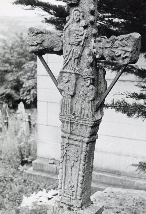 Croix de cimetière de style gothique tardif. Bras et fût de la croix hérissés de crochets. Extrémités renflées à feuillages. D'un côté est sculpté le Christ crucifié entre la Vierge et saint Jean ; de l'autre, la Vierge à l'Enfant au-dessus de deux personnages (dont un ange), surmontée d'un dais tenu par un ange.