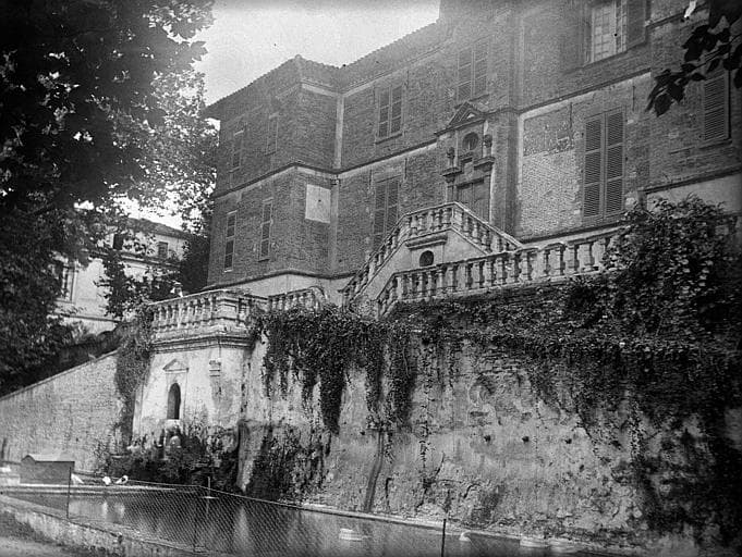 Côté ville, le parc aboutit au château. Côté rivière, se trouvent des jardins en terrasses à l'italienne. Cette résidence a sans doute été édifiée au début du 17e siècle. Le bâtiment des communs a été construit au 19e siècle à l'emplacement de l'ancienne entrée du parc où l'on arrivait par une grande allée aboutissant à une sorte de cour d'honneur demi-circulaire. Sur un dessin de 1663, seuls existaient le château et le pavillon de lecture, ainsi que les terrasses et le bassin circulaire. Les architectures du parc sont en brique ; balustrades et mains-courantes en pierre. Les marches sont en dalles de pierre et carreaux de terre cuite. Les deux façades du château sont ornées d'un motif central. Un fronton circulaire couronne les deux motifs d'entrée et forme une saillie prononcée au-dessus de la toiture à faible pente. L'intérieur a été fort remanié et ne conserve que quelques ornements sculptés en sous-sol.