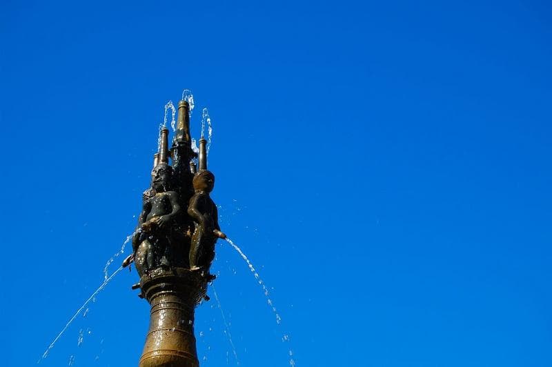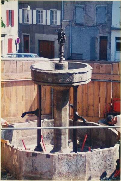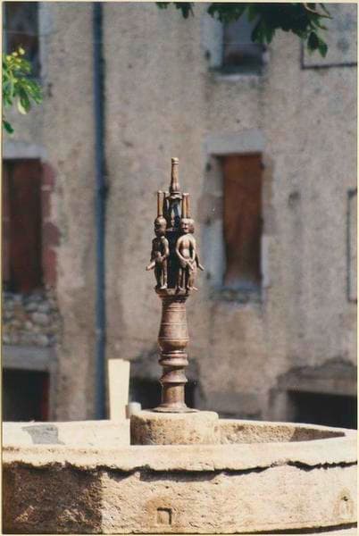 La fontaine, dite "des Pisseurs", est alimentée par les eaux canalisées de la source dite la "Font Franque". Elle se compose d'un bassin de puisage inférieur pouvant servir d'abreuvoir, et d'une vasque supérieure portée par une colonne centrale. Le milieu de la vasque est occupé par un motif que constitue une sorte de balustre supportant les quatre petites figures (les pisseurs), lesquelles cantonnent un petit piédestal surmontant le balustre et couronné par quatre dauphins accolés dont les queues, au sommet du motif, portent en prolongement le tube de jet sur la tête. Les figures en bronze semblent avoir été fondues séparément dans le même moule, puis rapportées et fixées à leur emplacement. Le bassin et la vasque supérieure sont de plan duodécagonal. La colonne centrale, couronné d'un chapeau d'encorbellement à biseau, est octogonale.