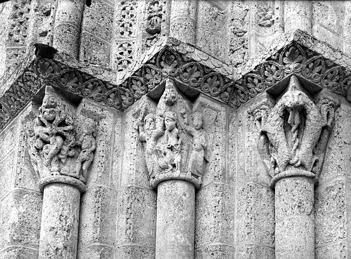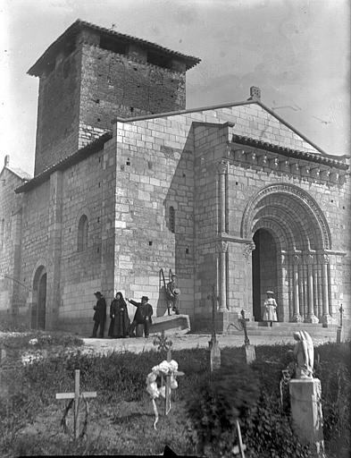 L'église, entièrement construite en pierre, se compose d'une nef avec bas-côtés dont le mur qui mène au choeur est percée de deux petites fenêtres ornées chacune de deux colonnes miniatures aux chapiteaux à feuille d'eau. L'édifice s'ouvre par un grand portail en arc plein cintre richement orné (ornementation végétale, têtes humaines et d'animaux...). Les chapiteaux des colonnes du portail représentent la tentation d'Adam et Eve, le sacrifice d'Abraham, le mauvais riche. A l'intérieur, au centre de l'église, quatre colonnes soutiennent un commencement de coupole. Bas-côtés et sanctuaire sont voûtés tandis que la nef est couverte par un plafond à planches.
