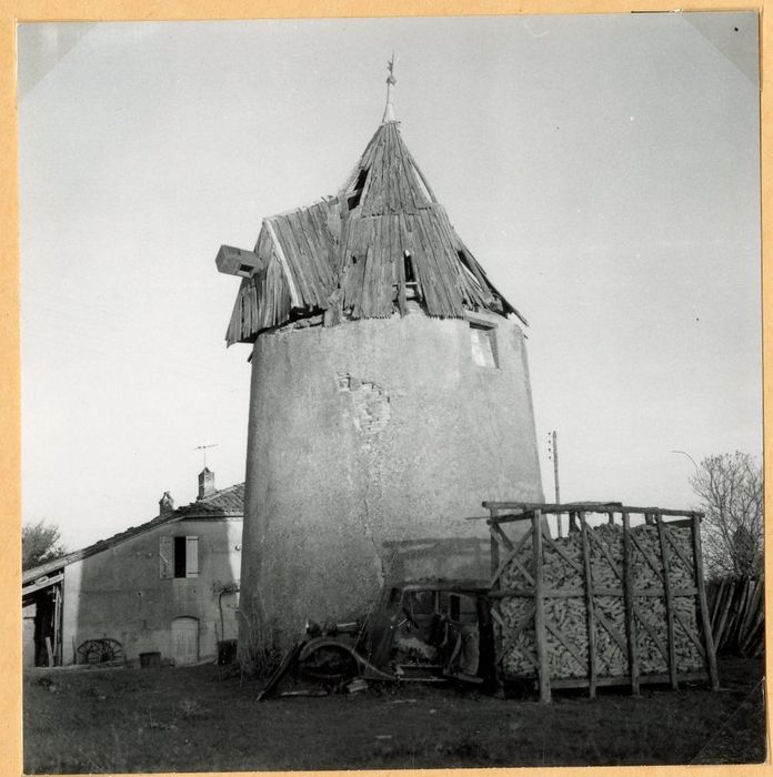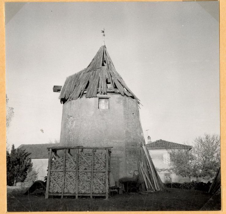 Connue aussi sous le nom de moulin de Saint-Angel, cette tour tronconique sur butte artificielle, construite en brique avec de rares assises en pierre, portait l'inscription "achetté en 1759", gravée sur une brique scellée au dessus de la porte d'entrée. Cette date, aujourd'hui disparue, est rappelée par un écriteau à l'intérieur de la salle en rez-de-chaussée surélevé, équipée de deux paires de meules. Jadis une paire de meules était située à l'étage, comme en témoignent les empreintes de l'escalier suspendu laissées dans la maçonnerie et les ouvertures. Vers 1940, un moteur à essence remplace l'énergie éolienne. Le moulin cesse son activité quelques années plus tard en 1951 ; la toiture et les ailes sont refaites en 1979. Ce moulin a été consolidé à sa base par un cerclage en fer, après la tempête de décembre 1999.