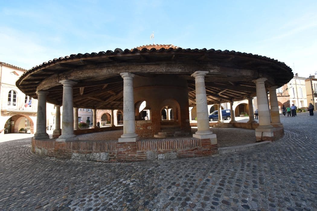 La halle se situe au centre de la place triangulaire qu'entourent des maisons dont le rez-de-chaussée forme galerie couverte, localement appelée "Enbans". De plan circulaire, la halle comprend deux parties. Un portique extérieur soutenu par vingt colonnes doriques à fût renflé. Un noyau central ajouré de huit arcades sur lesquelles s'élèvent une lanterne qu'éclairent quatre fenêtres. Dans cette partie centrale, au sol surélevé de quelques marches, se trouvent les anciennes mesures en pierre. Les experts jurés et le fonctionnaire chargé de la police du marché devaient s'y tenir.