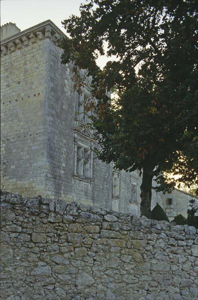 Ce château est lié à la mémoire du chevalier Arnaud Guilhem de Barbazau, surnommé le "chevalier sans reproche" et le "restaurateur du royaume et de la couronne de France", qui défit en combat singulier sous les murs du château de Montendre les six représentants de l'armée anglaise et fut autorisé à porter les armes pleines et entières de la Maison de France, sans altération ni brisure. Mort en 1432 de blessures de guerre, il fut inhumé à Saint-Denis avec les honneurs royaux. Est également lié à l'histoire du château, Jean-Jacques Le Franc de Pompigna, poète et fondateur de l'Académie de Montauban, dont l'ascendance maternelle était en possession de la terre de Gramont. Le château se présente comme un ensemble de constructions disposées en équerre. La branche nord est occupée par le château primitif du 13e siècle, constitué par un corps quadrangulaire épaulé au sud-est d'une tour carrée, dite Tour Simon de Montfort, découronnée et diminuée de trois mètres au 19e siècle. Au sud-ouest de cette tour, les écuries sont une adjonction du 17e siècle, ainsi que le portail à bossages de l'entrée qui a remplacé le pont-levis. Les fenêtres à croisée de pierre, les échauguettes et archères ainsi que la charpente sont une restauration du 19e siècle. L'aile Renaissance, sur plan classique, est constituée d'un corps central quadrangulaire, encadré de deux pavillons. L'appareil gothique des façades provient d'une forteresse qui occupait l'éperon rocheux au 14e siècle, à l'emplacement des terrasses sud.