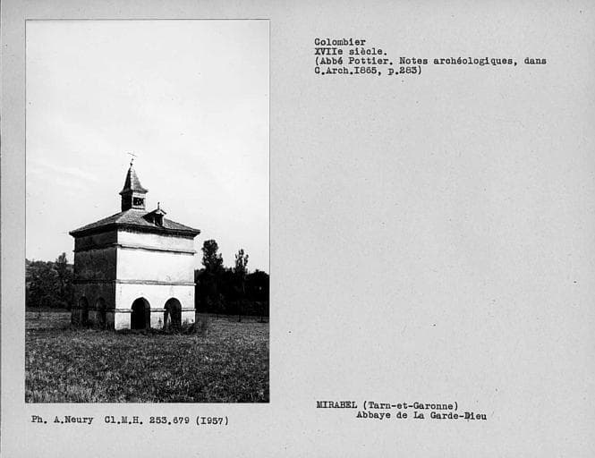 Pigeonnier en brique, situé en avant de l'ancienne abbaye. De plan carré, il est surmonté d'un clocheton central. La partie inférieure est couverte par une voûte d'arête en brique. L'accès sur chaque face se fait par deux ouvertures en plein cintre, sans fermeture. L'abbaye fut fondée au 12e siècle et rattachée à l'ordre de Cîteaux. Ruinée au cours des guerres de Religion, elle fut reconstruite au début du 18e siècle. En 1790, elle fut vendue comme bien national. Utilisée comme carrière, elle fut définitivement détruite par un incendie à la fin du 19e siècle.
