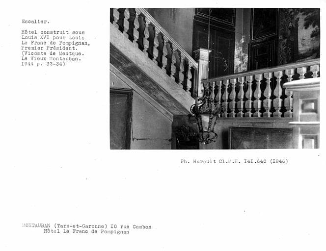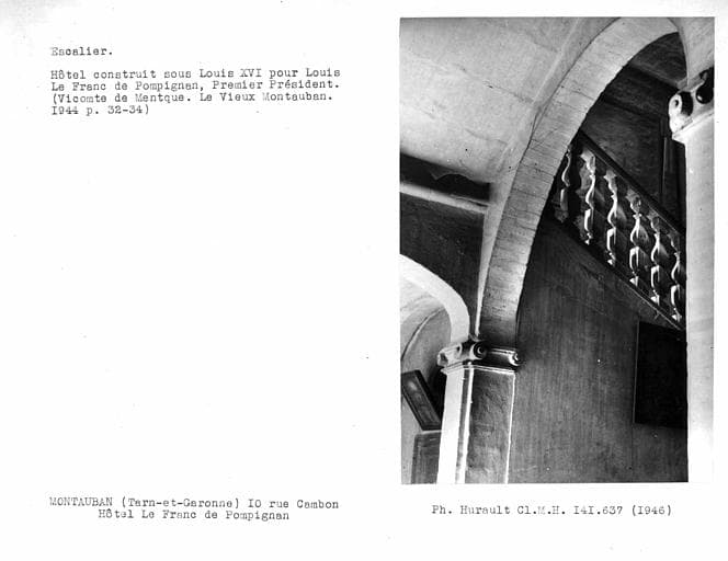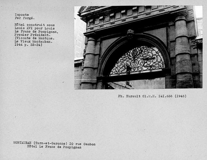 Bâtiment construit pour Le Franc de Pompignan, premier président de la cour des aides, dans la seconde moitié du 17e siècle. Il est constitué par des bâtiments en fer à cheval ouvrant sur la rue par un large portail d'ordre classique.