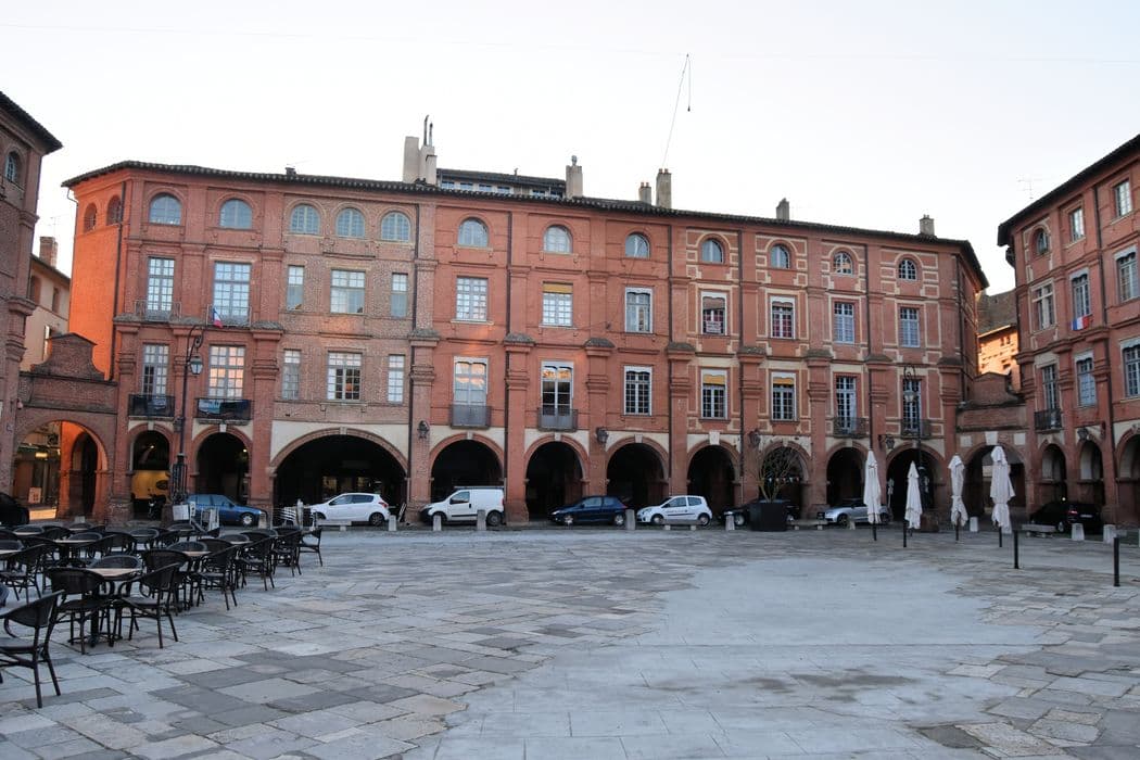 La place Nationale constitue un intéressant ensemble de maisons dont le rez-de-chaussée forme une double galerie voûtée sur croisées d'ogives et dont les trois étages sont divisés par des ordonnances régulières, sauf au troisième étage où les baies sont les unes rectangulaires, les autres circulaires. Quelques-unes de ces maisons portent les dates de 1516 et 1556. La construction de cette place est due à l'architecte toulousain Pierre Besneville. Toute la construction est en briques, à l'exception des clefs des arcs, des voûtes et des appuis de fenêtres.