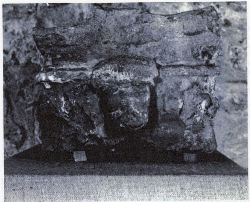 Le fragment de bas-relief en marbre représente une tête juvénile de face dont les cheveux, en mèches ondulées et nettement séparées, font songer à une divinité solaire. A l'arrière se voit un vestige de décor architectural. Le bas-relief est très faible et le travail un peu grossier rappelle celui de certains sarcophages antiques de basse époque. Identification erronée d'un chapiteau médiéval, déposé et donné depuis plus de 30 ans au musée communal (il a depuis disparu des collections).