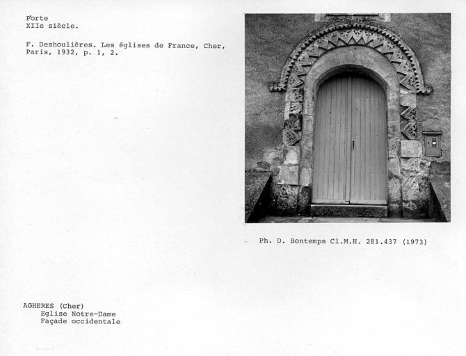 L'église paroissiale fut d'abord une simple chapelle concédée au 11e siècle à une petite communauté d'ermites par les seigneurs de Menetou-Salon. En 1075, les mêmes donateurs firent don de la chapelle à l'abbaye bénédictine Saint-Sulpice de Bourges qui y établit un prieuré. Ce dernier formait un enclos entouré de fossé. L'érection en paroisse en 1768, à la demande des habitants d'Achères, entraîna la disparition du prieuré. Vendue comme bien national, l'église fut achetée par la commune. Les autres bâtiments du prieuré devinrent propriété privée. De l'enclos subsistent la chapelle devenue église, les fossés encore visibles à l'est de celle-ci ainsi que les bâtiments transformés au 19e siècle. £La chapelle a sans doute été construite par les Bénédictins au début du 12e siècle. Au 15e siècle, deux chapelles sont ajoutées ou substituées aux bras du transept, l'une au nord, l'autre au sud. Au 19e siècle, l'église fit l'objet de restaurations (agrandissement ou percement de baies, réfection des enduits extérieurs et intérieurs).