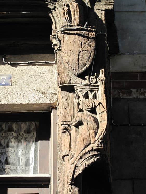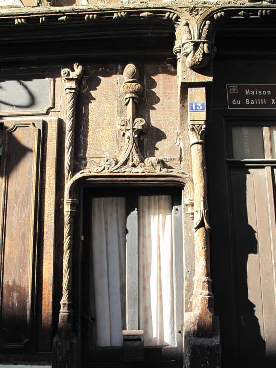 Cette maison est du début du 16ème siècle et porte les chiffres et le blason de Robert Stuart et de ses épouses Anne Stuart et Jacqueline de la Queille. La maison forme aujourd'hui deux propriétés séparées. Vieille maison à façade en pans de bois dont le rez-de-chaussée de l'une des deux parties a conservé sa disposition complète avec une porte d'entrée ornée de deux poteaux richement décorés avec un gâble à fleuron. La poutre avancée qui supporte le premier étage est elle-même ornementée d'une cordelière avec noeuds. La fenêtre en bois à meneaux du premier étage est sculptée avec une recherche toute particulière.