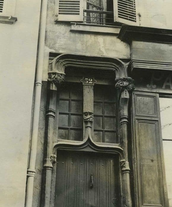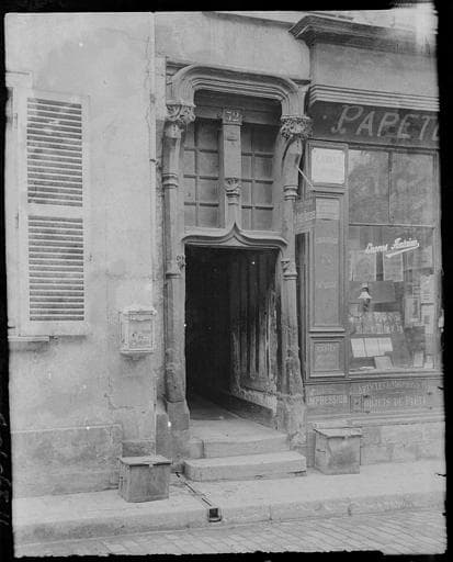 La porte de cet immeuble est l'un des plus parfaits exemples qui se puissent trouver de l'art des charpentiers et des huchiers du Moyen Age. L'encadrement à nervures prismatiques s'orne de consoles à chapiteaux de feuillages sur lesquels porte la sablière. Dans la partie supérieure de l'encadrement, une accolade surmonte l'huis et se développe dans l'imposte.
