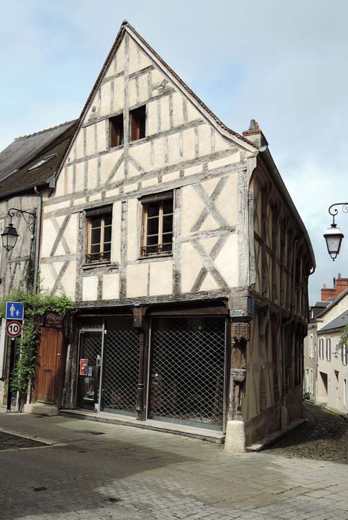 Maison acensée, en 1463, par le chapitre de Saint-Ursin, au barbier Philibert Guérin, à charge de construire à neuf une maison de trois étages. La maison comporte un rez-de-chaussée et un premier étage. Le rez-de-chaussée sur rue devait avoir une boutique entièrement remplacée par une devanture moderne. Le premier étage et le pignon sur rue ont été recouverts d'enduit. Il ne reste apparent que le poteau cornier décoré d'une niche dont le support est formé de trois têtes accolées et le dais très ajouré, d'esprit gothique, est un des plus beaux. La façade sur la rue des Juifs se compose d'un étage en saillie sur une poutre moulurée. Des poteaux en bois avec chapiteaux et bases moulurées séparent des compartiments avec croix de Saint-André.