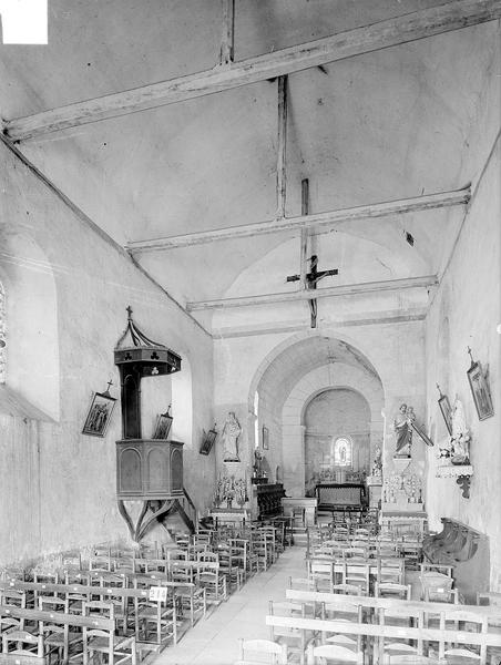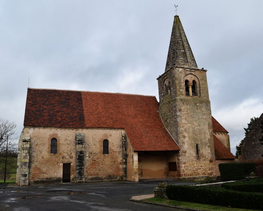 L'église date du début du 12e siècle. Elle comprend une nef couverte en charpente apparente (16e siècle), sans bas-côtés ; un choeur voûté en berceau plein cintre ; une abside voûtée en cul de four. Sur le côté sud du choeur s'élève un clocher carré surmonté d'une flèche en pierre dont le plan octogonal s'inscrit dans le carré du dernier étage. Le choeur est décoré d'arcatures avec pilastres carrés.