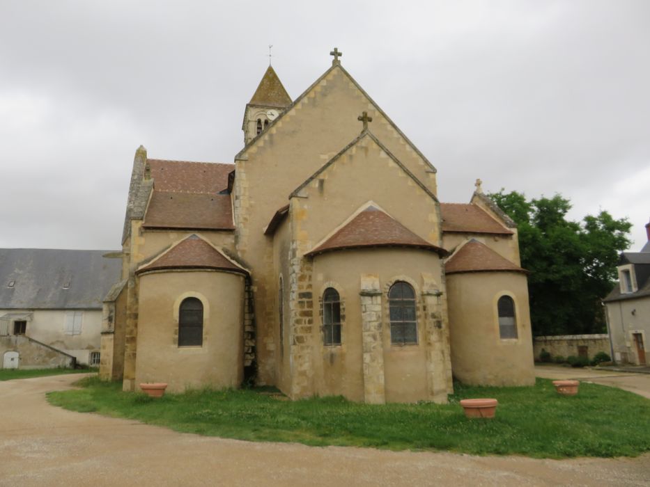 Le clocher-porche est daté tantôt du 11e siècle, tantôt du 12e siècle. Le portail ouest est du 13e siècle. Une chapelle a été ajoutée au sud de la nef au 15e siècle. Les parties hautes du choeur ont été reconstruites après un incendie survenu en 1772. L'édifice se compose d'une nef, d'un double transept aux absidioles sur plan demi-circulaire et d'un choeur composé d'une travée carrée sur laquelle s'ouvre un sanctuaire en demi-cercle. En avant de la nef, à l'ouest, se trouve un porche composé de trois travées. Sur la travée centrale s'élève le clocher carré haut de quatre étages. La nef, primitivement couverte par une charpente apparente, a par la suite été voûtée par des voûtes avec doubleaux et nervures reposant sur des piles, encastrées dans les anciens murs de la nef. Les transepts et la travée carrée du choeur sont voûtés en berceau plein cintre. Les absides sont couvertes en cul de four. La travée centrale du porche est fermée par une coupole sur pendentifs. Sous le porche, la porte a été refaite au 13e siècle et présente un tympan sculpté d'un bas-relief représentant l'Adoration des mages.