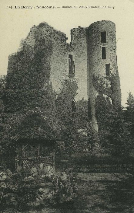 Vestige d'un important donjon que l'on attribue à Pierre de Giac, seigneur de Jouy en 1346, chancelier de France de 1373 à 1388, mort en 1407, et que l'on date des environs de 1370-1380. Le donjon est une construction sur plan carré, flanquée de tours circulaires aux angles. L'intérieur présentait plusieurs étages reliés par un escalier. Le rez-de-chaussée est couvert en berceau brisé et est éclairé par deux archères. Le premier étage est voûté d'ogives élevées sur des colonnettes d'angle aux chapiteaux ornés de feuillages. Les deux étages supérieurs sont recouverts d'un plancher. Au niveau du deuxième étage, la tour sud-est était aménagée en chapelle.