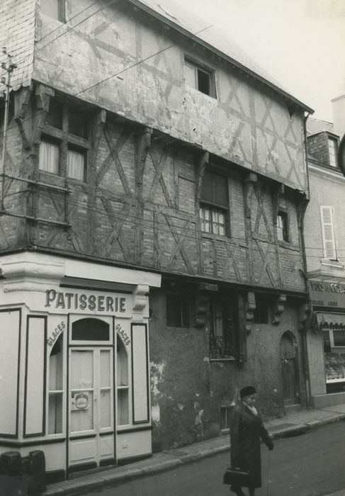 Maison d'angle, à pans de bois à croisillons, garnis de briquetage. Il y a onze rangées de croisillons par étage. Chacun de ces étages est en encorbellement et saillant. L'encorbellement du premier est supporté par des consoles de pierre faites de trois corbeaux en quart de rond superposés. A l'étage supérieur, les consoles sont en bois et placées comme des jambes de force. La charpente a été modifiée, ainsi que la pente et son bris. Elle est sur pannes et non sur chevron faisant ferme. Plusieurs fenêtres sont à croisées de bois. L'une d'entre elles a conservé son appui sculpté et mouluré.