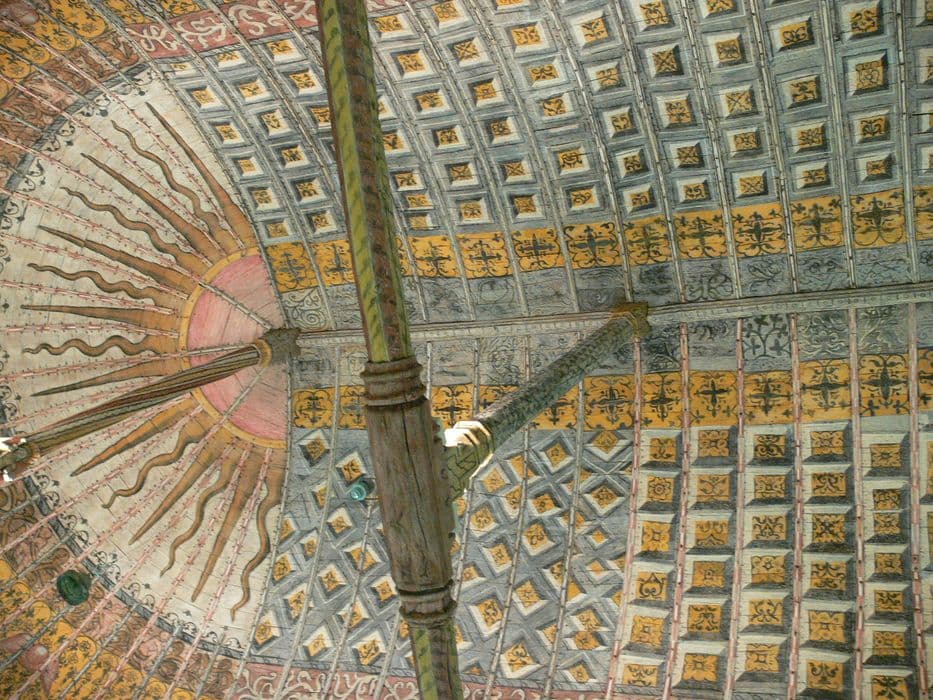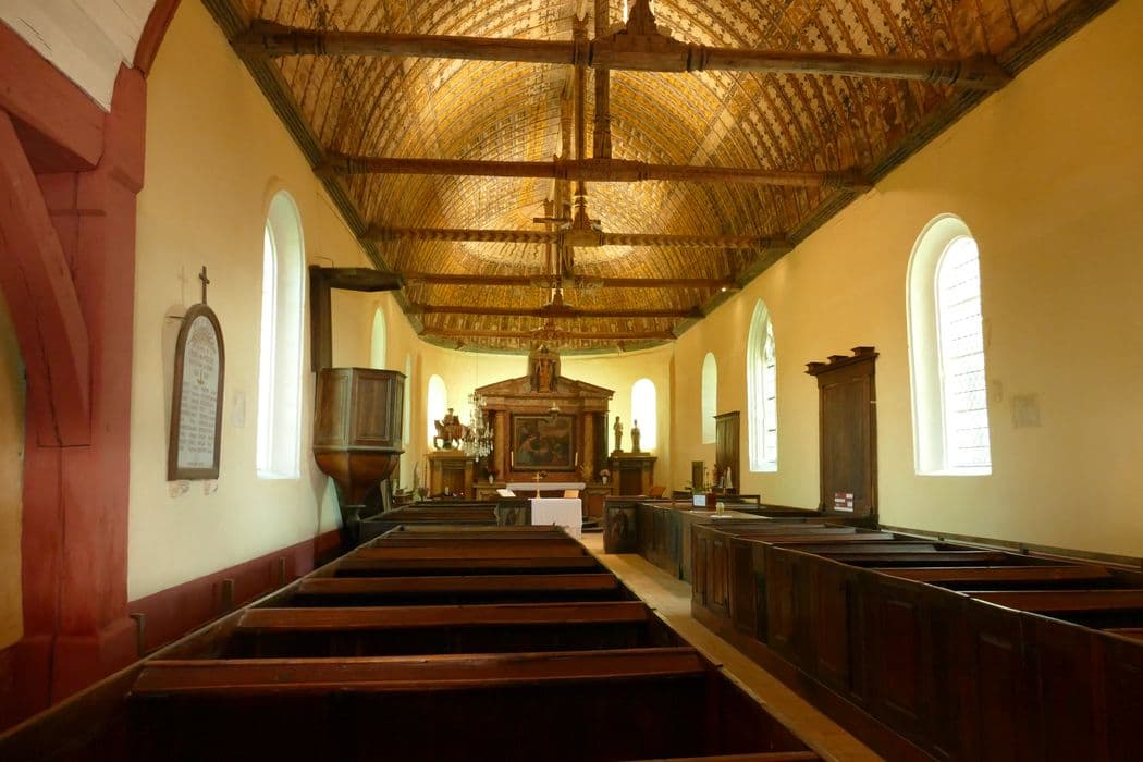 L'église se compose d'une nef sans bas-côtés, terminée par une abside demi-circulaire, le tout datant du 12e siècle, avec adjonction ou modification de fenêtres dans la nef au 15e siècle. La totalité de la construction est couverte par une charpente du 16e siècle, lambrissée en berceau. Sur la partie occidentale de la nef s'élève une flèche en charpente, portée à l'intérieur de l'édifice par six poteaux. Les bardeaux des lambris de la nef et de l'abside, sont décorés de peintures du 16e siècle, avec personnages dans la partie basse et motifs décoratifs sur le reste du lambris.