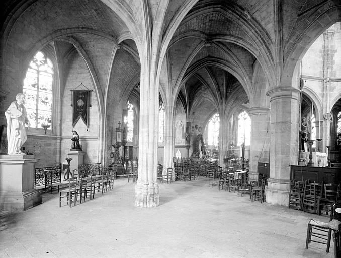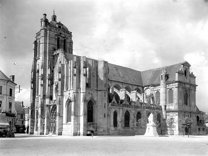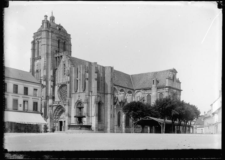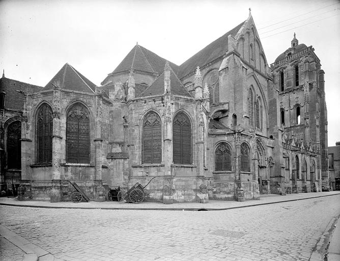 Le choeur se termine en hémicycle et est entouré de six chapelles formant chacune une saillie. Deux portes s'ouvrent sur la façade principale. Un pilier divise par le milieu la plus grande.Toutes deux sont à cintre surbaissé et environées de guirlandes de vigne. Les piédroits sont ornés de statuettes posées dans des niches surmontées d'un dais. Un grand bas-relief, aujourd'hui mutilé, représentant l'entrée du Christ dans Jérusalem, occupait le tympan de la plus grande des deux portes. La porte du transept nord était également surmontée d'un bas-relief représentant le Christ dans une mandorle.