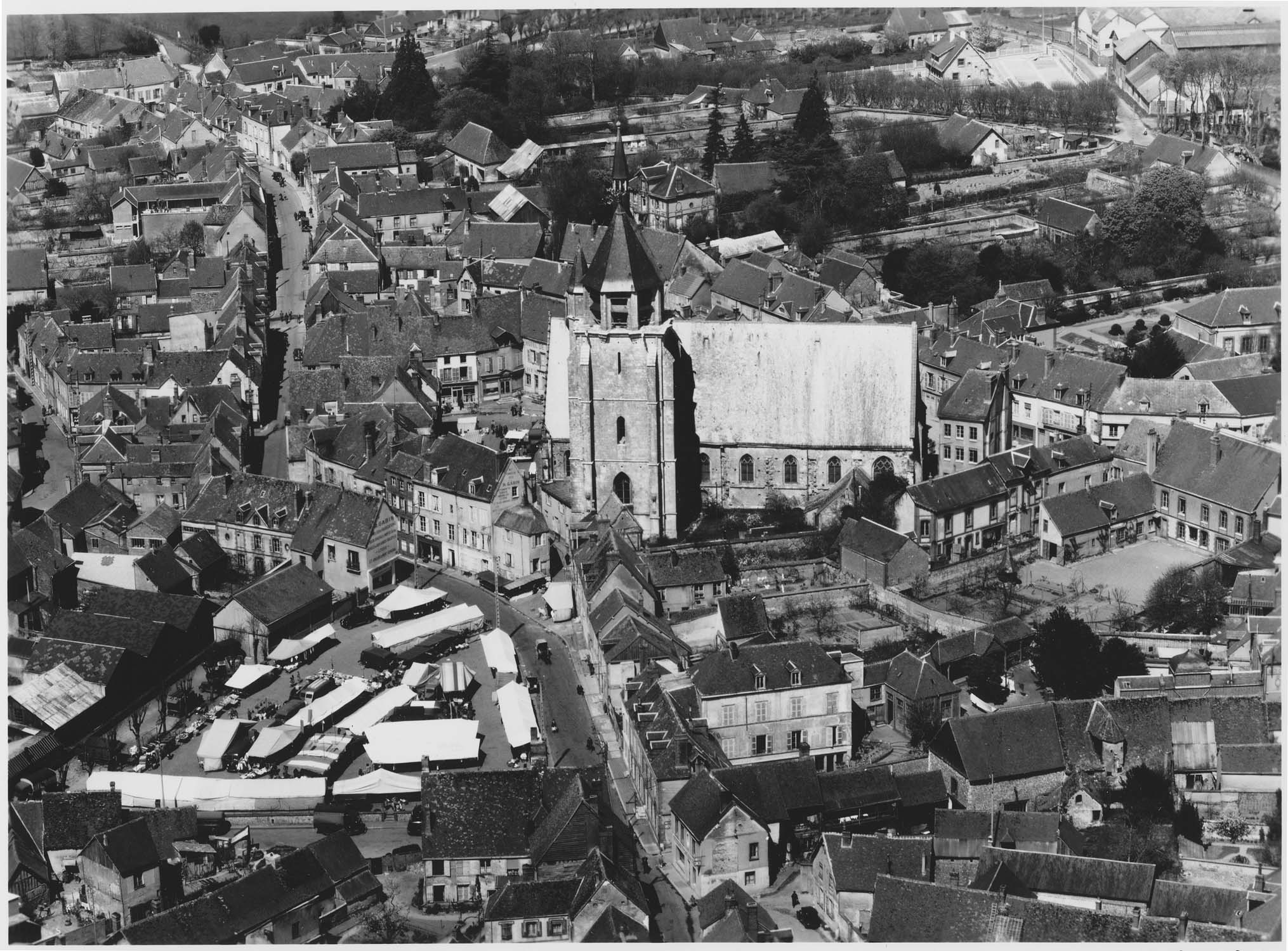 Eglise actuelle reconstruite après la guerre de Cent ans. Le choeur est achevé en 1453, en prolongement de la nef romane. L'année 1497 marque l'achèvement de l'église avec l'édification du clocher et des travées, jusqu'à la façade occidentale. L'église conserve au nord les restes de l'édifice antérieur, sans doute du 11e siècle, dont restent la porte romane et deux baies. Le portail occidental, de style gothique international, a été remanié à une époque inconnue, sans doute suite aux destructions causées par les guerres de religion. Restaurations au 16e siècle et en 1895. Des traces de couleurs dans la chapelle de la Vierge témoignent de la présence de peinture murale dans l'église gothique. Riche mobilier datant des 15e, 16e et 17e siècles. Vers 1685, les autels gothiques sont remplacés par un retable, et les parois sont revêtues de lambris. Dans la seconde moitié du 19e siècle, l'église est entièrement restaurée et redécorée. Entre 1909 et 1911, les maisons adossées au nord et à l'ouest de l'église sont supprimées pour créer la Grande Place.