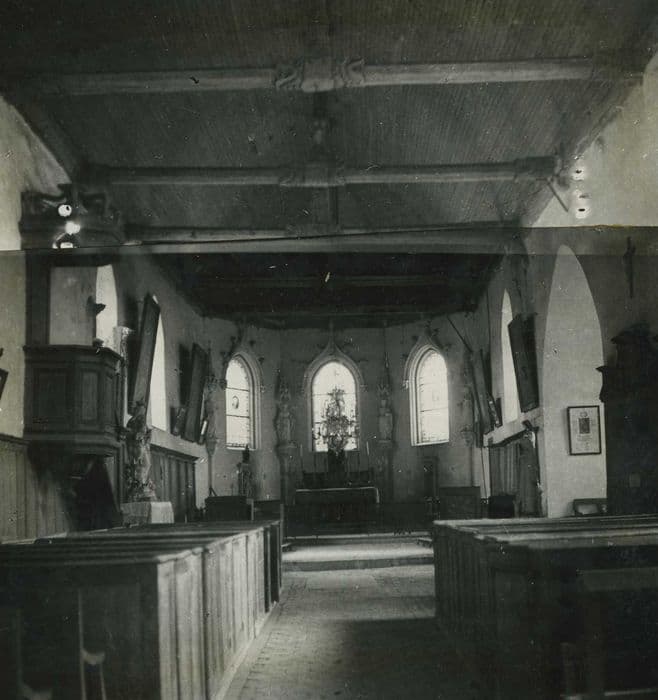Nef unique terminée par un choeur à trois pans. L'intérieur est couvert par une voûte en planches laissant entraits et poinçons apparents. Les entraits comportent des parties sculptées au centre et aux extrémités. Un clocher est accolé à la nef. De forme massive sur plan carré, flanqué aux deux angles extérieurs de contreforts, et à l'angle nord-ouest d'un escalier en tourelle, il ne comporte qu'une petite baie sur chaque face, au dernier étage. Au rez-de-chaussée, il est percé de trois baies et, à l'angle de la toiture, se trouve une gargouille sculptée.