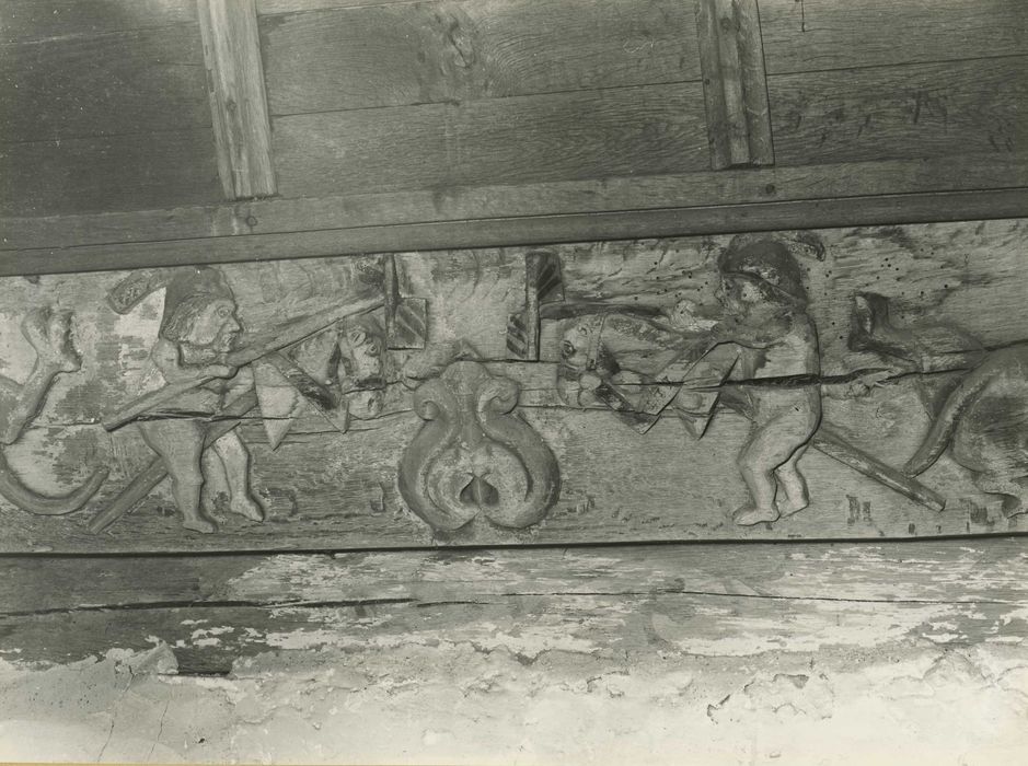 Edifice sans bas-côté ni déambulatoire, terminé par un choeur à trois pans. La tour carrée du clocher est accolée à la façade sud. La partie du 16e siècle comprend le choeur et les deux travées qui le précèdent. La partie du 12e siècle comprend la nef et la tour du clocher. L'intérieur est couvert d'une voûte de bois du plus grand intérêt. Une voûte de pierre avait été prévue sur la partie du 16e siècle, comme en témoignent les supports engagés et les amorces de nervures. Elle a été remplacée par une voûte de bois dont les entraits sont placés plus haut que la nef. La charpente de la nef est richement décorée de motifs végétaux, d'animaux fabuleux, de scènes animées et de médaillons. Des traces de polychromie sont visibles en plusieurs endroits.