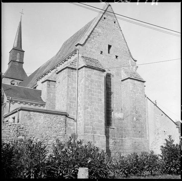 L'église est construite en granit et remonte, pour son ensemble, au 13e siècle. Elle comprenait primitivement une longue nef unique, un choeur à chevet plat et un porche très vaste, ajouré sur trois faces, précédant un petit portail à colonnettes. Les chapiteaux du choeur sont ornés de feuillages. Les voûtes de la nef ont été refaites au 14e siècle. Le porche s'orne d'un bas-relief du 16e siècle représentant Saint-Jean tenant un calice, la Vierge tenant l'Enfant, et un autre saint, sous trois dais à fleurons et pinacles. Au-dessus du porche, le clocher est formé de deux étages d'arcatures, le second étant ouvert par quatre fenêtres géminées. Du côté nord, se trouve une chapelle seigneuriale. Au 17e siècle, quatre travées de bas-côtés ont été construites à la suite de cette chapelle. A la fin du 15e siècle, une chapelle seigneuriale fut construite du côté sud.
