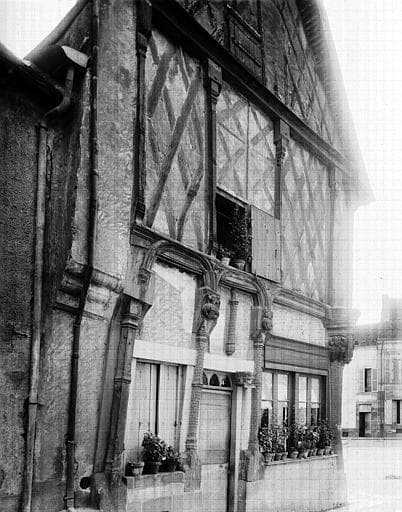Cette maison est à pans de bois sur mur bahut avec pignon arrière en pierre. Elle a perdu sa tourelle d'angle. Les pans de bois sont ornés de sculptures. Un poteau cormier avec trois figures, quatre autres poteaux avec des angelots porteurs d'armoiries, décorent le rez-de-chaussée. Au premier étage, entre les remplissages en croix de Saint-André, sont des poteaux avec bases, chapiteaux et bagues.