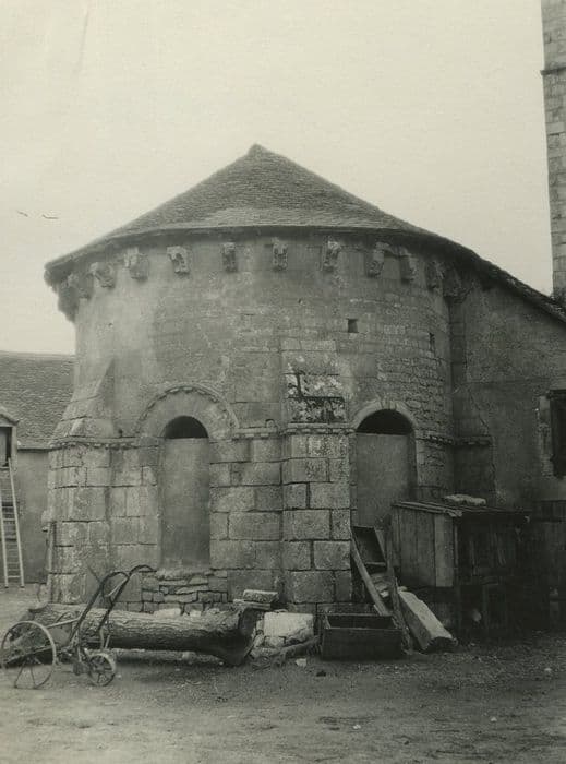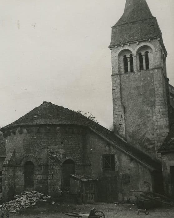 De la première église susbsiste un clocher du 12e siècle ainsi que l'abside. Le clocher se présente comme une tour surmontée d'un étage ajouré et d'une flèche moderne en bois, recouverte d'ardoises en 1817. Chaque face est décorée de deux grandes arcades reposant au centre sur une colonne presque entièrement dégagée. Les colonnes sont ornées de chapiteaux à feuillages ou à têtes. Dans ces baies se trouvent deux autres petites arcades retombant également au centre en des colonnettes en délit, ornées de chapiteaux ornés. L'abside en cul de four, la travée du choeur voûtée et le transept sont également de bons vestiges du 12e siècle.