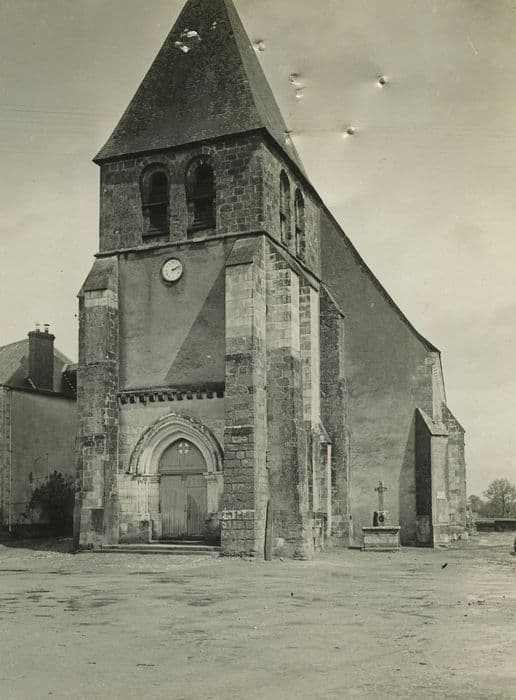 L'église se compose de deux parties distinctes. Le clocher de la fin du 12e siècle forme porche. Un premier portail de quatre colonnettes et de deux pieds droits avec chapiteaux à crossettes et bases à griffes, donne accès à une salle carrée voûtée d'arêtes nervées, avec un deuxième portail analogue au premier et peint. La seconde partie de l'église date du 15e siècle. Elle se compose de deux nefs semblables. Le chevet plat était percé de deux fenêtres à meneaux flamboyants. Les voûtes sont couvertes de peintures (feuillages traités sur fond jaune pâle en ocre rouge et indigo, avec fleurettes blanches). La chapelle seigneuriale s'orne également de peintures représentant une litre peinte en noir sur laquelle se détachent des blasons. En-dessous sont représentés divers personnages ou scènes (Sainte-Catherine, Saint-Jacques, messe de Saint-Grégoire, scène de chasse).