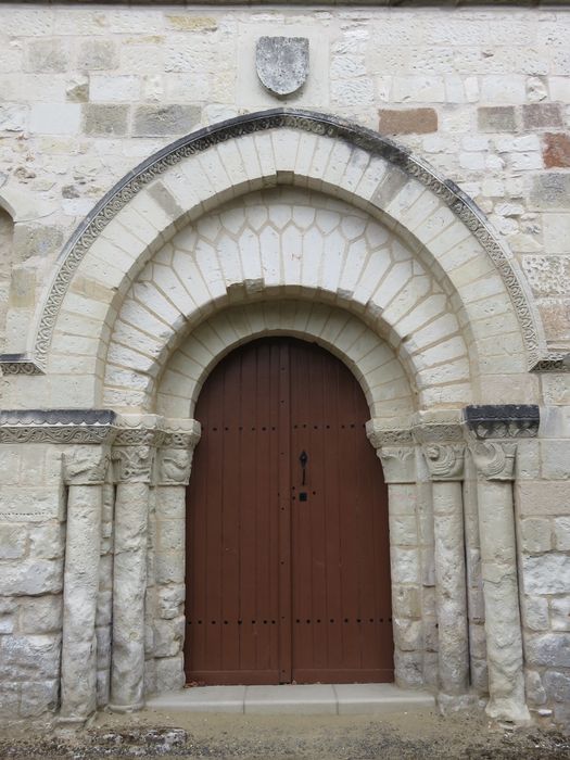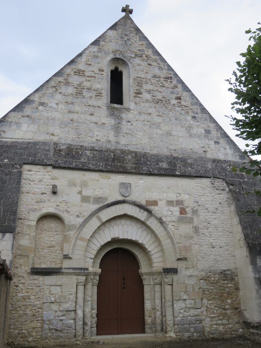 La façade ouest est percée d'une porte en plein cintre à deux rouleaux, dont le second est circonscrit par un troisième clavage, monté postérieurement, en arc brisé. Les rouleurs retombent sur des colonnettes dont les chapiteaux sont ornés de feuillages ou d'animaux fantastiques. L'accès à la nef se fait également par une porte latérale sud datant du 18e siècle, dont le linteau est décoré d'un médaillon. La nef et le choeur rectangulaire, refait au 18e siècle mais conservant son chevet du 12e, ont été intérieurement restaurés en 1924, ainsi que deux chapelles latérales. Le clocher flanque l'église au sud. Son rez-de-chaussée est couvert d'une voûte d'ogives retombant sur des culs de lampe dont deux sont décorés de têtes, un troisième de quatrefeuilles, le quatrième d'un écu. Sous le choeur, une crypte voûtée en berceau fut la crypte funéraire de la famille de Richelieu. Une autre crypte est située sous la chapelle nord.