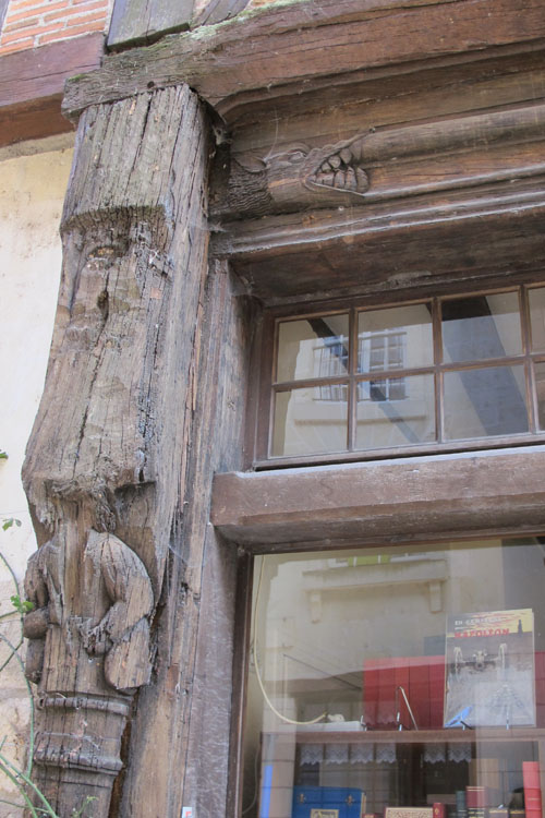 Maison d'angle élevée au-dessus d'un rez-de-chaussée de pierre, de deux étages en bois, en encorbellement.