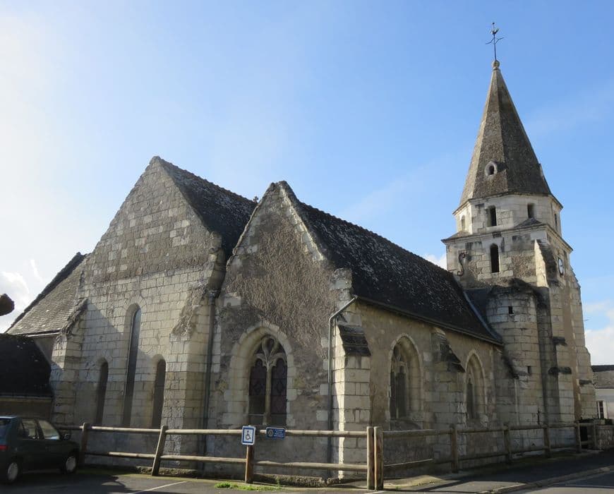 L'église appartenait primitivement au chapitre d'Orléans qui le vendit, au 11e siècle, à l'abbaye de Saint-Julien. Un prieuré lui fut ajouté, qui fut cédé un peu plus tard à l'abbaye de Beaulieu. L'édifice carré se compose d'une nef romane, primitivement unique, et de collatéraux faits de chapelles contigües datant, au sud, du 15e siècle, et au nord, du 16e siècle. Le chevet plat est percé de trois fenêtres datant de l'époque primitive. Du côté nord se trouve une tour carrée qui soutient le clocher. Une flèche octogonale se pose sur un étage intermédiaire à huit pans.