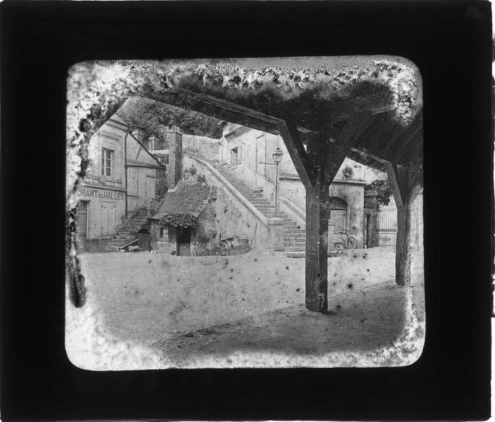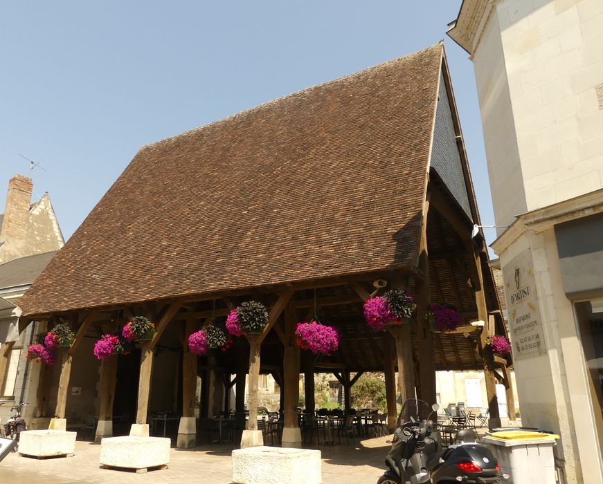 Vaste construction du 15e siècle, entièrement en charpente, présentant trois nefs inégales de quatre travées chacune, sous un seul grand comble. Elles comprenaient primitivement deux travées de plus, la dernière travée du comble portée sur les murs de pierre formant un local accolé à un bâtiment ayant été détruite. Les quatre travées sont constituées par cinq fermes portées sur de forts poteaux de bois isolés du sol sur dés de pierre. Charpente à chevrons sur pannes. Les vieilles halles en bois étaient autrefois assez nombreuses en Touraine, mais ont eu tendance à disparaître avec l'apparition du chemin de fer qui a facilité les échanges.