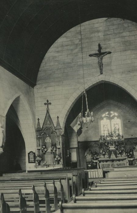 D'une église primitive datant du 9e ou 10e siècle, subsiste le mur de chevet du choeur, en petit appareil. La nef, reconstruite au 12e siècle, a été restaurée et couverte d'une charpente avec lambris moderne. Elle aboutit à un choeur carré, voûté sur croisée d'ogives. Au 16e siècle, la nef a été doublée d'un collatéral avec lequel elle communique par trois arcades en arc brisé. Les trois travées sont voûtées en croisées d'ogives dont les clés armoriées ont été bûchées. Ce bas-côté aboutit à une chapelle latérale au choeur. Ce dernier est flanqué, au sud, d'un clocher dont la partie supérieure a été refaite au 16e siècle. La salle du rez-de-chaussée est voûtée sur une croisée d'ogives moulurées d'un tore et retombant sur des culots décorés de figures humaines.