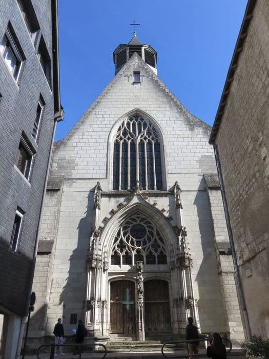 Contigüe à l'ancien prieuré des Carmes, l'église fut bâtie en 1473 à l'emplacement de la première église conventuelle dont il ne subsiste aucune trace apparente, et se substitua par la suite à l'église paroissiale Saint-Saturnin qui fut détruite à la Révolution. Tandis que le bas-côté sud, voûté sur arcs d'ogives aux formerets en tiers-point, offre les caractéristiques de l'architecture religieuse du 15e siècle, le bas-côté nord, avec ses voûtes en anse de panier, témoigne des transformations du 19e siècle. La décoration intérieure semble avoir été refaite consécutivement à la construction du bas-côté nord, comme l'indique le millésime 1864. Le choeur est meublé de stalles en provenance de l'abbaye de Cormery. Les pilastres des piliers nord de la nef sont les contreforts qui appartenaient au premier édifice. Les vitraux datent de 1890. La baie n°4 consereve des fragments de vitraux provenant du château de Chenonceaux.