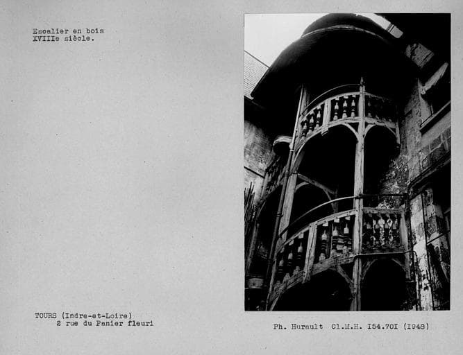 Cet escalier est placé dans l'angle nord-ouest d'une petite cour qui fut celle de l'ancienne hôtellerie à l'enseigne du Panier Fleury, comme l'indique encore sur la façade de l'immeuble, un panier rempli de fleurs sculpté sur la muraille. Il est appuyé à deux façades dont celle du nord est plus ancienne, datant du 15e siècle. L'escalier hélicoïdal, avec palier à chaque étage, est garni de balustres moulurés. Un étroit passage circulant sous la travée inférieure, relie la cour au couloir conduisant à la rue, et permet l'écoulement des eaux évacuées par le caniveau de cette cour.