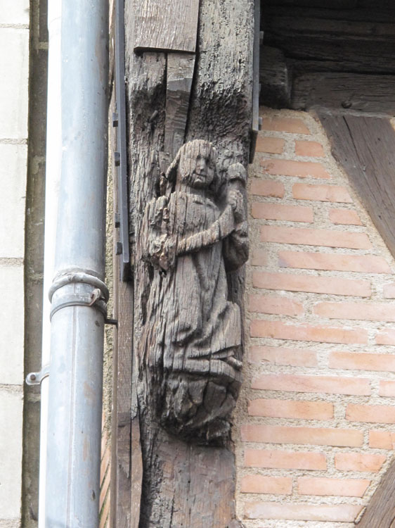 Maison élevée d'un rez-de-chaussée et de trois étages dont le dernier est dans le comble. Les poteaux corniers subsistent, dont certains ont conservé leur décoration par des têtes d'angelots.