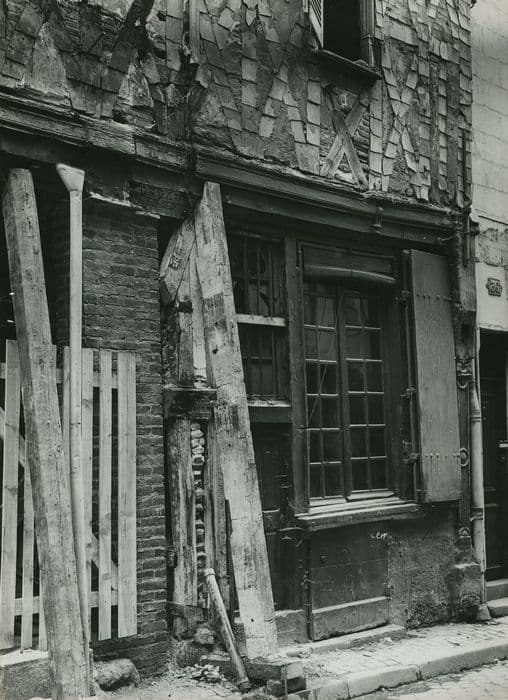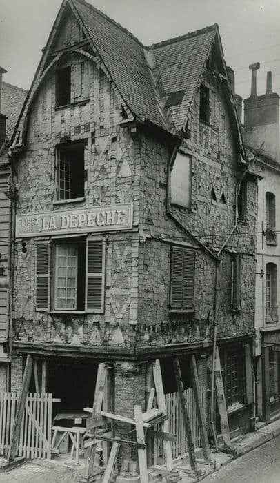 Maison présentant deux façades en pans de bois. Le rez-de-chaussée, à usage de boutique, était soutenu à l'angle par un poteau cornier sculpté, portant des traverses également décorées. Le plafond du rez-de-chaussée et la hotte d'une vaste cheminée, furent rénovés lors de travaux. Ils étaient peints et offraient des traces d'une décoration par des couronnes royales, des fleurs de lys et l'initiale L de Louis XI. Tous ces vestiges décoratifs ont été rapidement masqués ou détruits lors de l'aménagement d'une boutique.