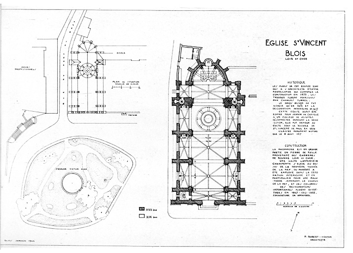 L'église a été commencée en 1626 et achevée en 1677 après une longue interruption dans les travaux. Les plans auraient été conçus par François Mansard qui dirigeait alors la construction du château de Blois, ordonnée par Gaston d'Orléans. Cependant, quelques dessins de la bibliothèque de Quimper permettent de croire qu'un architecte jésuite, le père Martilange, ne fut pas étranger à cette construction. Jusqu'en 1764, cet édifice servit de chapelle au collège des Jésuites pour lequel il avait été construit. Pendant la Révolution, il devint Temple de la Liberté et, en 1826, église paroissiale. £C'est un monument de dimensions restreintes. Sur sa façade se trouvent les trois ordres classiques superposés. A l'intérieur, la disposition générale et la décoration obéissent à une ordonnance dorique. Le choeur est très richement décoré. De chaque côté du maître autel se trouvent deux monuments élevés par Mlle de Montpensier à la mémoire de Gaston d'Orléans.
