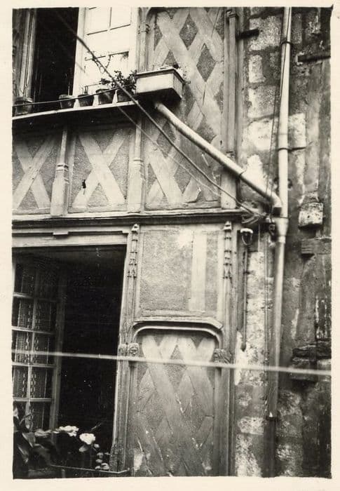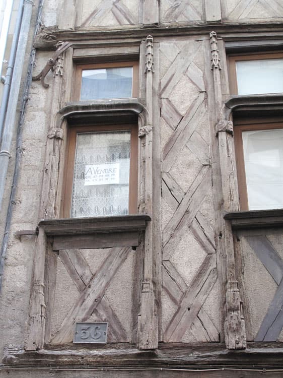 Le rez-de-chaussée est en maçonnerie, le reste de la façade en pans de bois avec panneaux à grandes croix de Saint-André. A chaque étage, la fenêtre principale est encadrée de colonnettes en bois sculpté (chapiteaux à fleurons). Chaque étage est séparé par une frise en bois, celles du premier et du second étant sculptées aux extrémités. A l'intérieur se trouve un escalier à vis en bois, avec rampe moulurée.