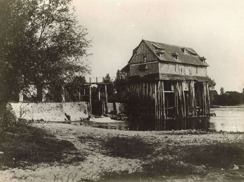 Le moulin aurait été bâti au 16e siècle. Il se composait d'un grand bâtiment rectangulaire, de quinze mètres de long sur sept de large, porté sur des pilotis. Il était relié à la rive droite de la rivière par une passerelle, également sur pilotis. Un comble à deux pentes le couvrait, avec pignon sur chacun des petits côtés. Les roues à aubes se trouvaient entre les pilotis, et pouvaient être élevées ou abaissées selon le niveau du Cher. Au-dessus, dans le bâtiment construit en pan de bois avec remplissages de briques, avaient été disposés les locaux d'habitation et de mouture. Le moulin a été utilisé jusque dans les années 1910. Probablement effondré entre 1950 et 1951.