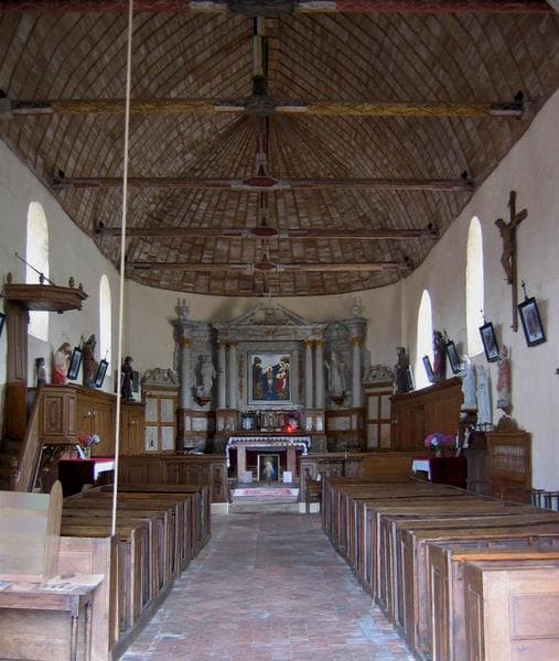 L'église présente une nef simple terminée par une abside en hémicycle. La façade occidentale présente trois arcades en plein cintre, celle du milieu renfermant le portail. Des contreforts gothiques ont été ajoutés aux angles. A l'entrée du coeur, deux colonnettes en bois sculpté portent un Christ en bois sculpté du 16e siècle.