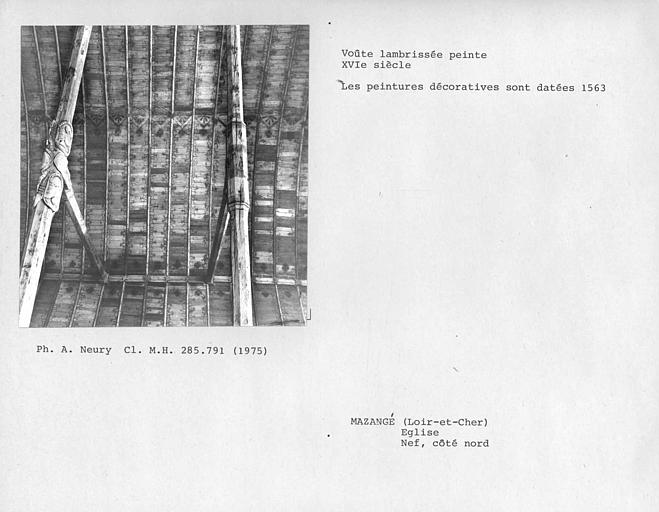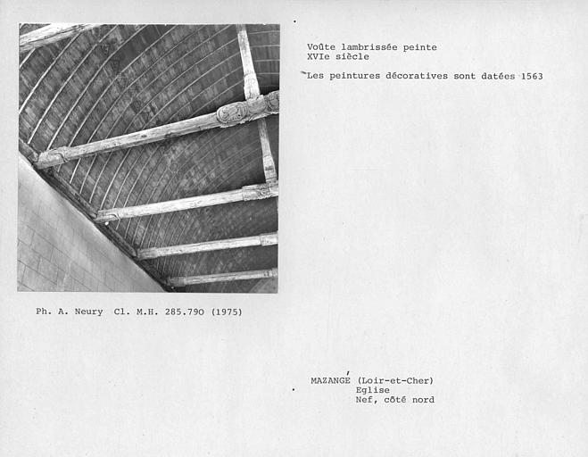Mazangé est connu depuis le 9e siècle comme prévôté de Chartres. La nef remonte au 15e siècle et est couverte par une charpente lambrissée ornée d'une décoration peinte. La nef unique est suivie d'un choeur à chevet plat plus récent, que suit la sacristie. Dans l'angle de la nef et du choeur s'élève le clocher. Celui-ci, daté du 12e siècle, constitue la partie la plus ancienne de l'église, hormis les maçonneries du mur nord qui sont le vestige d'une église archaïque à choeur rectangulaire, dont le mur sud fut complètement détruit pour élargir l'édifice. Directement inspiré de celui de la Trinité de Vendôme, le clocher se compose d'une tour rectangulaire à deux étages, percée d'étroites fenêtres, et d'une haute flèche octogonale en pierre.