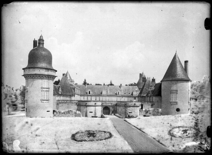 La construction du château commence en 1543 pour se terminer en 1573. L'édifice présente un plan carré féodal avec quatre tours rondes aux angles, des bâtiments sur trois côtés et est flanqué, du côté de l'entrée, de deux tours rondes dont il ne reste que la partie inférieure. La tour ouest est surmontée d'un chemin de ronde décoratif reposant sur de faux mâchicoulis. Un pavillon en retour fait, de chaque côté, un décrochement s'alignant sur les ailes en retour du bâtiment principal. A l'est, le château est relié au pavillon et au bâtiment Henri II par une galerie tardive. Cette partie est traitée en orangerie. Au sud-est du château se trouve le quadrilatère fermé des dépendances.