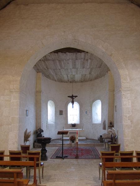 Eglise de style roman (12e siècle) , désaffectée depuis le 19e siècle, époque à laquelle la nef fut vendue et transformée en grange. Cet édifice dépourvu de transept reçut quelques modifications à cette époque afin de permettre son aménagement en bâtiment agricole. Jusqu'au 14e siècle, l'église appartenait à une seigneurie ecclesiastique dépendant de la Commanderie Saint-Marc d'Orléans. Elle comporte une nef unique ouvrant, par un arc triomphal légèrement brisé, sur un choeur semi-circulaire plus étroit. Les murs sont en moellons, la pierre de taille étant réservée aux chaînages d'angle et aux encadrements de fenêtres.