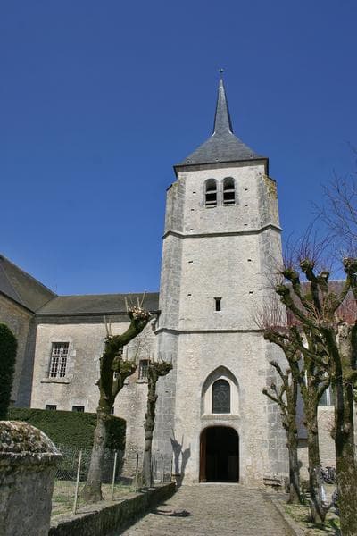 Cette église est l'ancienne chapelle castrale, et fut édifiée en même temps que lui, après 1520. En 1638, la façade ouest fut reconstruite dans le prolongement de la façade de l'aile centrale du château sur cour. L'église se compose d'une nef prolongée à l'ouest au 17e siècle, et reliée au pignon nord de l'aile est du château. L'abside polygonale est éclairée par deux fenêtres en tiers point à réseau flamboyant. Une chapelle latérale est reliée à la nef au nord. Un clocher carré amorti par une flèche, flanque la nef du côté méridional.