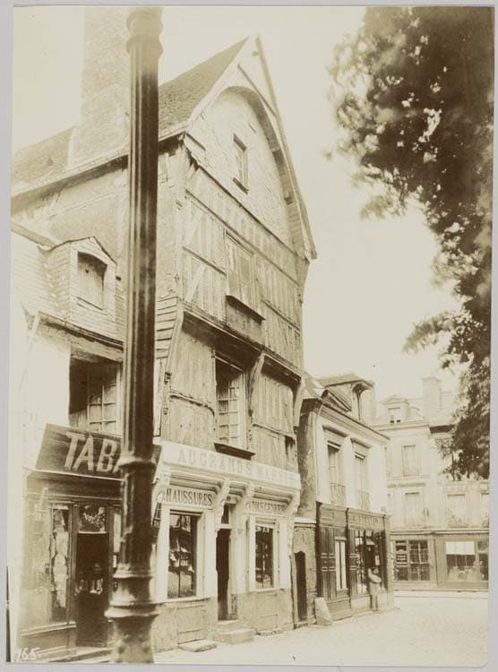 Maison avec façade à pans de bois, de la fin du 15e siècle ou du début du 16e. Elle présente trois étages surmontés d'un pignon dont la ferme extérieure de charpente, en saillie, a ses jambettes et aisseliers portés par des liens. Aux premier et second étages, poteaux, traverses, sablières et liens sont moulurés de profils indiquant l'époque de la construction. Le deuxième étage est en encorbellement sur le premier, lequel l'est également sur le rez-de-chaussée. Entre les bois, les vides sonts remplis de briques apparentes. Les liens du rez-de-chaussée sont sculptés, représentant Saint-Louis portant un écusson, Saint-Jean-Baptiste, Saint-Nicolas et Saint-Martin.