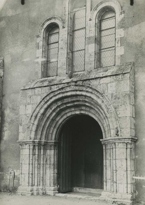 Portail en pierre possédant quatre arcs plein cintre moulurés, avec tores et cavets. Le listel du premier arc porte une ornementation en dents de scie. La sculpture présente des caractères du début du 13e siècle.