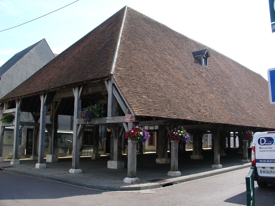 La halle est attestée dès 1285. En 1358-1360, elle fut brûlée par les Anglais. Sa reconstruction fut entreprise en 1452-1453. La halle appartient au groupe des halles ouvertes, de plan rectangulaire, avec nef encadrée de deux bas-côtés séparés par des piliers de bois. Couverte d'un toit à quatre pans, elle repose aujourd'hui sur deux rangées de piliers, contre quatre en 1901-1913.
